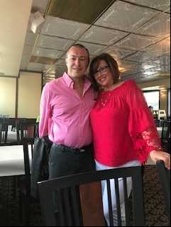 Two women smiling and standing side by side. The woman on the left has short gray hair and is wearing a sparkly blue top, while the woman on the right has shoulder-length brown hair, glasses, and is wearing a black cardigan over a sparkly dress.